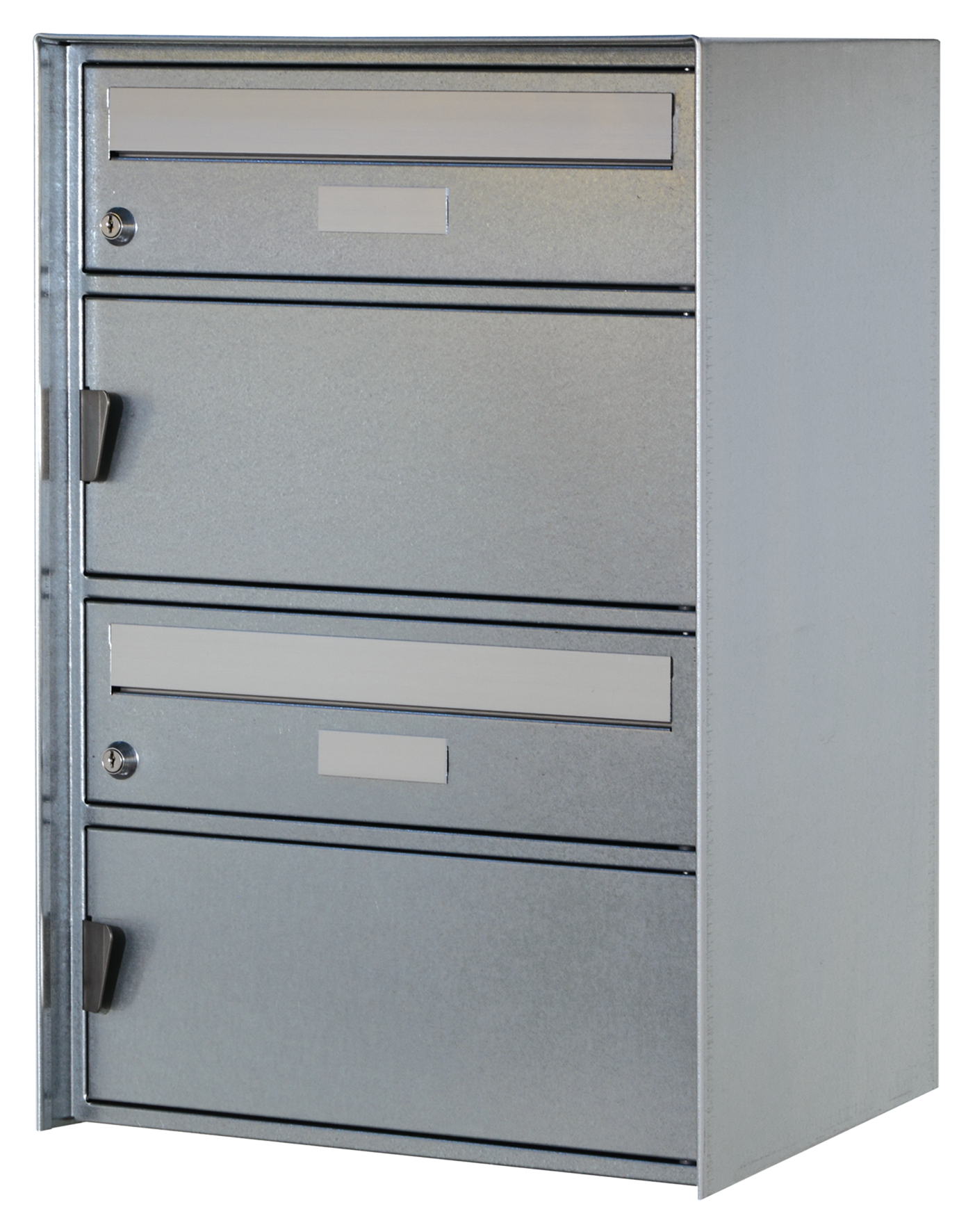 Stahl sendzimirverzinkt, 2 Briefkästen übereinander, Briefeinwurfklappen farblos eloxiert, Montage mit Seitenstützen oder Wandmontage, Lieferumfang: Schloss inkl. je 2 Schlüssel, auswechselbare Alu-Namenschilder, ohne Stützen, zusätzlich erhältlich: "Bitte keine Werbung"-Schild, auf Anfrage: erhältlich mit KABA/KESO/SEA-Ausschnitt, erhältlich als Gruppenkombination (seitlich verschraubt, gegen Aufpreis), Postnorm.