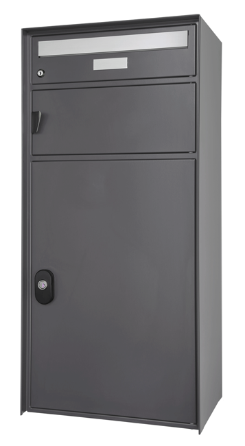 Stahl sendzimirverzinkt, pulverbeschichtet, Briefeinwurfklappe farblos eloxiert, abschliessbares 65 l Packetfach (inkl. 2 Schlüssel), Montage mit Seitenstützen oder Wandmontage, Lieferumfang: Schloss inkl. 2 Schlüssel, auswechselbares Alu-Namenschild, ohne Stützen, zusätzlich erhältlich: "Bitte keine Werbung"-Schild, auf Anfrage: erhältlich mit KABA/KESO/SEA-Ausschnitt, Drehspannverschluss mit Drucktastschloss (inkl. 2 Schlüssel), durch Drücken auf das Schloss kann die Paketfachtüre vom Boten verriegelt werden, geöffnet wird das Schloss mit dem Schlüssel des Empfängers.