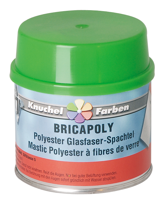 aluminiumhaltiger und elastischer 2-Komp. Füll- und Flächenspachtel, eignet sich für die Reparatur schadhafter Stellen, die starken Vibrationen ausgesetzt sind wie im Kfz-Reparaturbereich, Karosserie- und Fahrzeugbau, Industrie- und Anlagenbau sowie von Booten und Wohnwagen, BRICAPOLY lässt sich grossflächig leicht und porenfrei aufziehen, ist schnell, leicht und staubarm schleifbar und lässt sich mit allen handelsüblichen Ein- und Zweikomponenten-Produkten überlackieren, Vorbehandlung: der Untergrund muss sauber, trocken, staub-, rost-, öl, fettfrei und gut angeschliffen sein