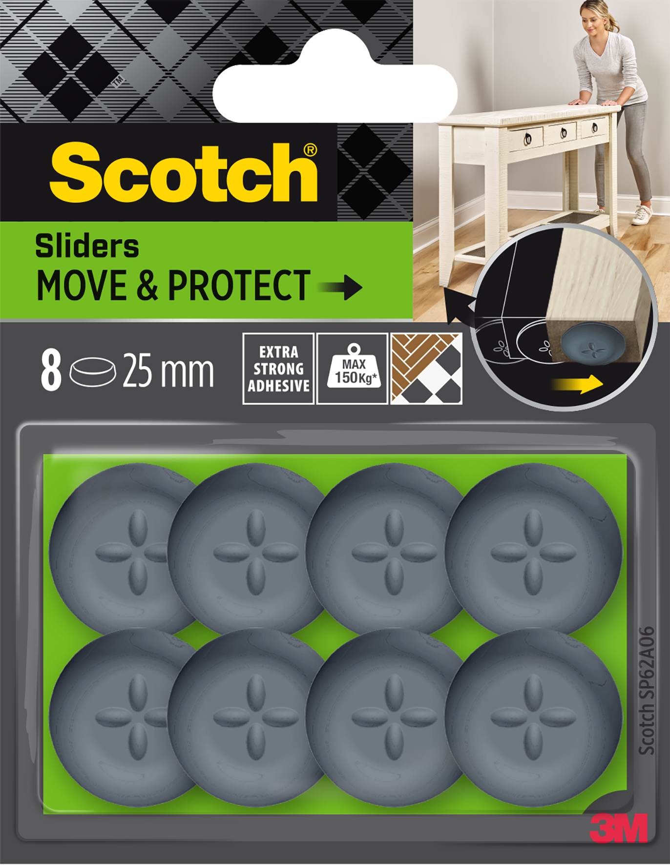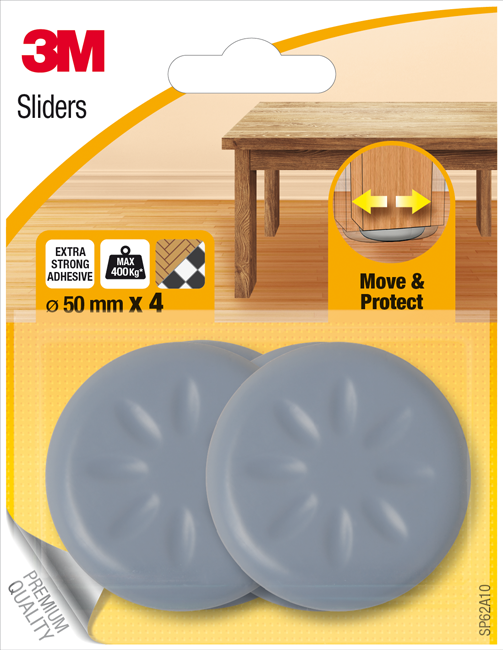 Die Scotch® Move & Protect Selbsthaftenden Gleiter lassen sich dauerhaft befestigen und erleichtern das Bewegen von Möbeln und Geräten. Sie verfügen über einen starken, dauerhaften Klebstoff. Die gewölbte Polymeroberfläche ermöglicht das Bewegen von Möbeln mit bis zu 400 kg Gewicht. Die Gleiter sind in verschiedenen Formen und Grössen erhältlich.