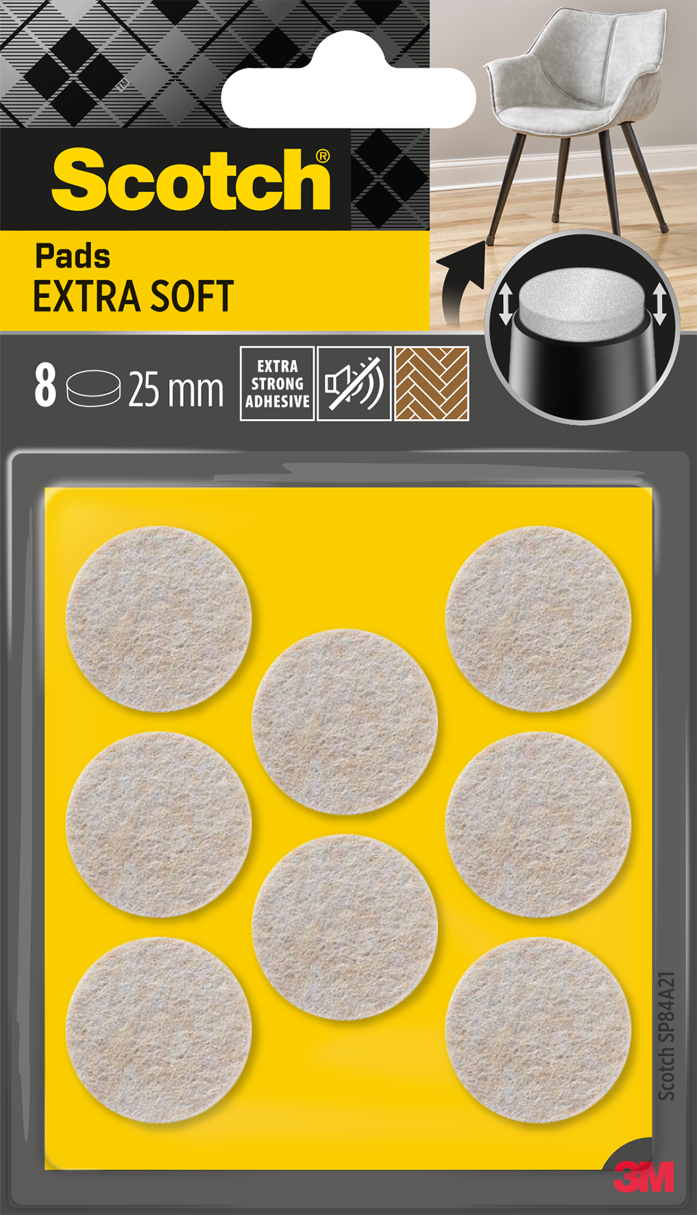 Bei den Scotch® Extraweichen selbsthaftenden Filzpads handelt es sich um dicke Pads aus weicher Wolle, die dazu dienen, empfindliche Böden und andere Oberflächen vor Abdrücken und Kratzern schützen. Sie bestehen aus hochwertigen Fasern und sind mit einem extra starken Klebstoff versehen, sodass sie sicher an Tisch- und Stuhlbeinen oder an Geräten befestigt werden können.