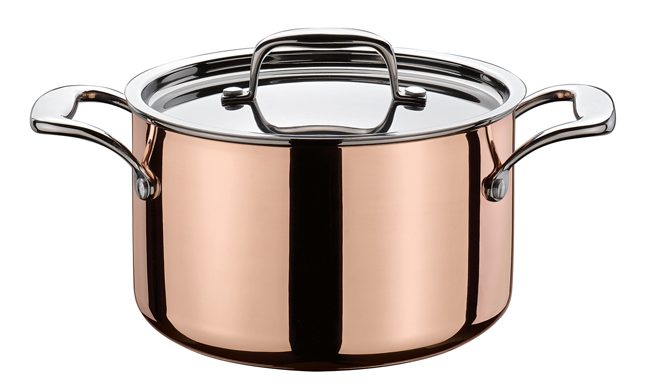 mit Deckel, Edelstahl, Aluminium, Kupfer, die Pfanne ist mit einem Anlaufschutz versehen, welcher vor dem ersten Gebrauch entfernt werden muss, für alle Herdarten inkl. Induktion geeignet, im kalten Zustand weist der Boden eine leichte Innenwölbung auf, bei der Wärmeaufnahme verschwindet diese Wölbung