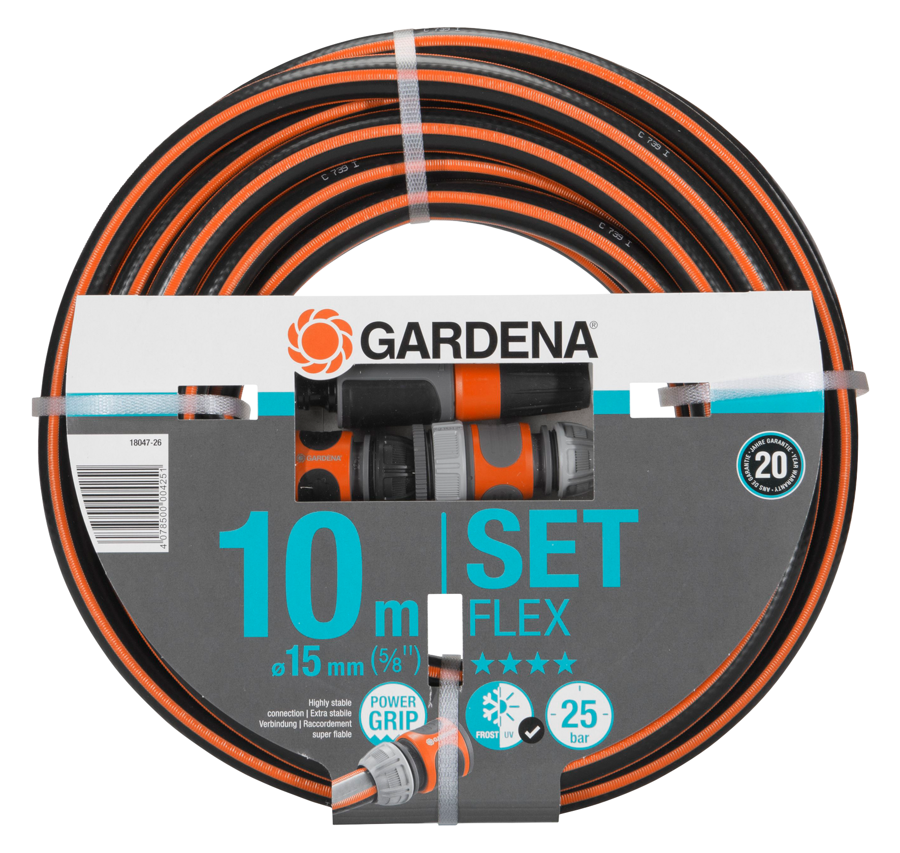 Die Grundausstattung von GARDENA mit Reinigungsspritze, Hahnverbinder, Adapter, Schlauchverbinder und Wasserstop ist optimal geeignet für die Reinigung und Bewässerung im Garten und rund ums Haus. Das Start-Set überzeugt mit einem schicken Design und ermöglicht dank der Robustheit und der hochwertigen Verarbeitung eine langlebige Verwendung. Der 2-in-1-Sprühstrahl der Reinigungsspritze liefert für verschiedene Situationen den optimalen Wasserstrahl – ob es sich um den Stechstrahl für Reinigungsarbeiten oder den weicheren Sprühstrahl zur Bewässerung handelt, der Wasserstrahl ist stufenlos einstellbar. Der integrierte Wasserstop erlaubt den Wechsel des Aufsatzgerätes ohne Gang zum Wasserhahn: Sobald ein Aufsatz gelöst wird, stoppt der Wasserdurchfluss und setzt erst nach Anbringen eines neuen Aufsatzes wieder ein. Das Komplett-Set kann an alle 1/2” – 5/8” (13–15 mm)-Schläuche angeschlossen werden und ist für Wasserhähne mit 26,5 mm (G 3/4")- und 33,3 mm (G 1")-Gewinde geeignet. Das Ready-to-use-Set ist UV- und frostbeständig, sodass es ganzjährig draussen im Freien bleiben kann. Das Qualitätsprodukt ist Made in Germany und GARDENA gibt eine Herstellergarantie von fünf Jahren.