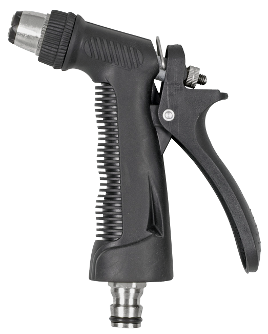 stufenlos einstellbare Pistolenspitzdüse vom kräftigen Vollstrahl bis zum sanften Sprühnebel, geschützt vor Beschädigungen durch Kunststoffring am Spritzenkopf, ergonomischer Griff mit Dauerarretierung, bequeme Einhandbedienung, regulierbare Wassermenge über Drehregler, besonders langlebig durch Messingstecker, kompatibel mit allen marktüblichen Stecksystemen