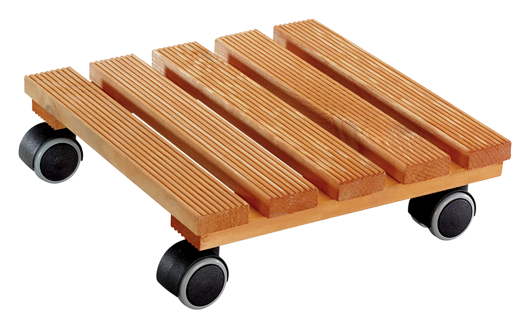 Buche massiv, mit 4 Lenkrollen ø 75 mm davon 2 mit Feststeller, für den Aussenbereich geeignet