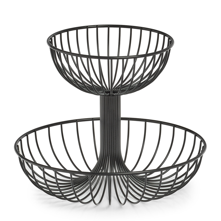 Dieser Obstkorb ist ein dekorativer Blickfang in jeder Küche. Auf zwei Ebenen können Obst oder weitere Lebensmittel wie Süssigkeiten ideal gelagert werden. Das Drahtmuster sorgt dafür, dass die Luft zwischen den Lebensmitteln zirkulieren kann. Gefertigt ist die Etagere aus schwarzem Metall im Industrial Stil. Der obere Korb besitzt einen Durchmesser von 21 cm, der untere ist mit 32 cm etwas grösser und sorgt für einen stabilen Stand.