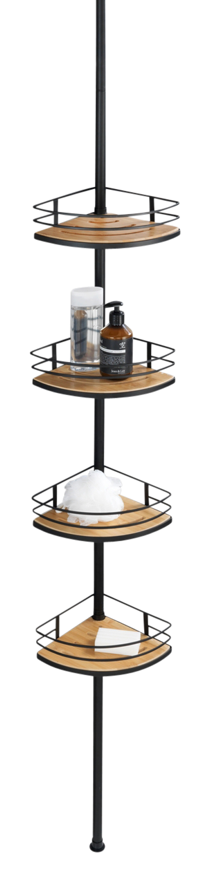 Das hochwertige Teleskop-Eckregal Dolcedo Bambus ist universell einsetzbar in Duschkabinen, Badewannen- und Zimmerecken. Das angesagte Design aus rostfreiem, schwarz-mattiertem Edelstahl in Kombination mit Bambus wertet jedes Bad auf. Bambus ist nicht nur hart und widerstandsfähig - auch unter ökologischen Aspekten bietet das Material Vorteile: Bambus ist ein schnell nachwachsender Rohstoff und liegt absolut im Trend. Das praktische Eckregal bietet mit vier Ablagen zahlreiche Abstellmöglichkeiten für Shampoo, Duschbad, Seife, Schwamm und andere Badeutensilien. Die Montage ist schnell und leicht - ohne bohren, da das Teleskop-Regal einfach zwischen Boden und Decke geklemmt wird. Die Höhe ist variabel, denn die teleskopische Stange ist zwischen 65 bis 275 cm einstellbar. Die Teleskopstange ist aus massiver Qualität und hat einen Rohrdurchmesser von 22 mm.