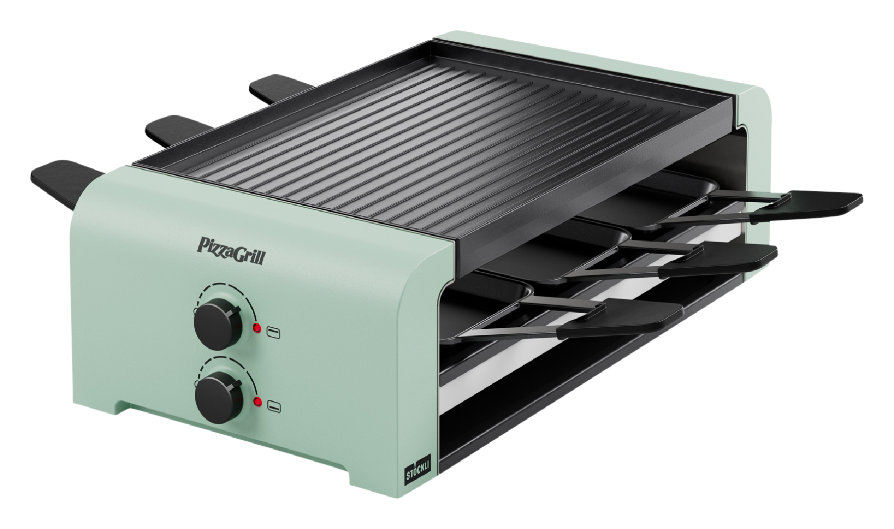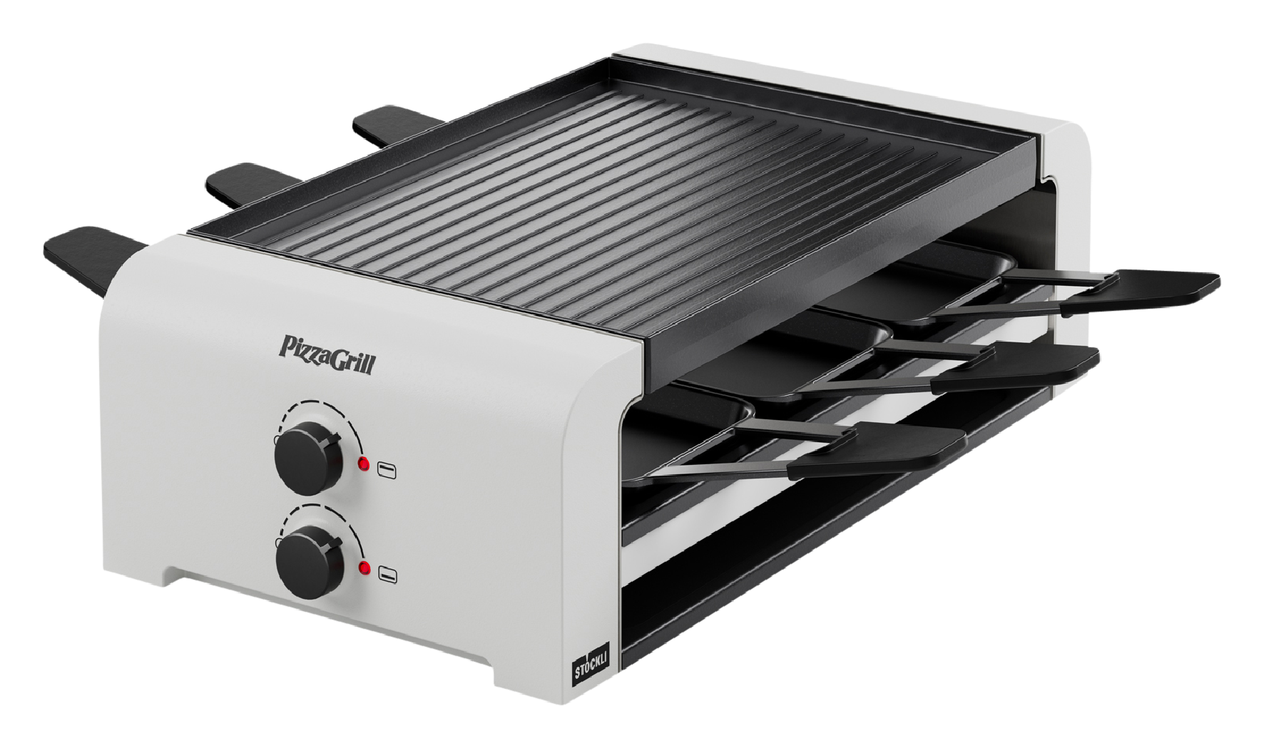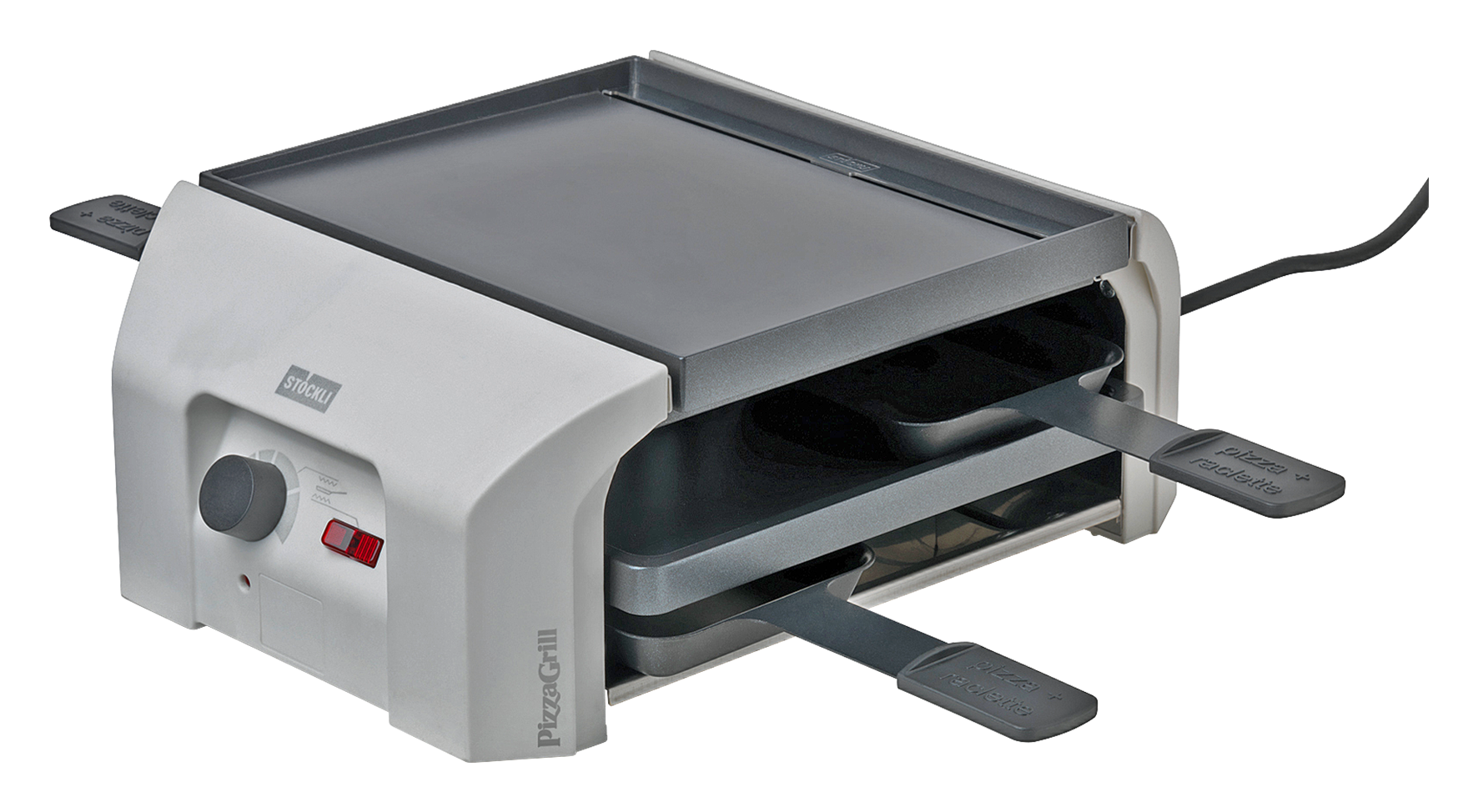 PizzaGrill mit den Funktionen Pizza, Grill und Raclette für 4 Personen, das Endgerät lässt sich an das Basisgerät anschliessen mittels Verbindungskabel oder Verbindungsstecker und erweitert die Kapazität auf 8 Personen, inkl. 4 Pfännchen sowie 4 Spachtel