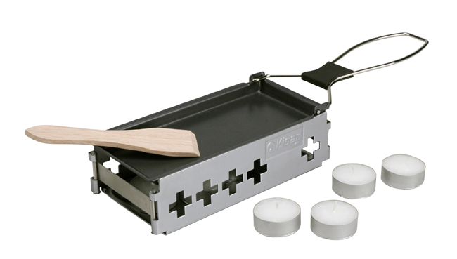 aus Stahl, zusammenfaltbar, mit 1x antihaftbeschichtetem Raclettepfännchen, 1x hitzebeständiger Kunststoffspachtel, 3x Rechaudkerzen