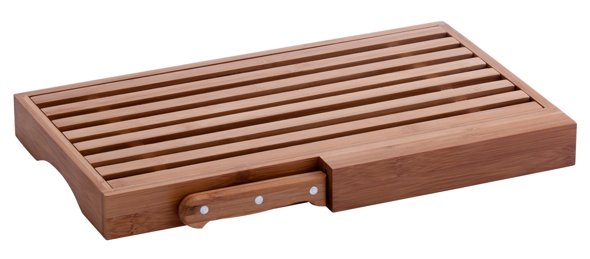 ein Bambusdeckel, der gleichzeitig als Schneidebrett und Serviertablett für Ihr Brot dient, komplett mit Rillen zum Auffangen von Krümeln
