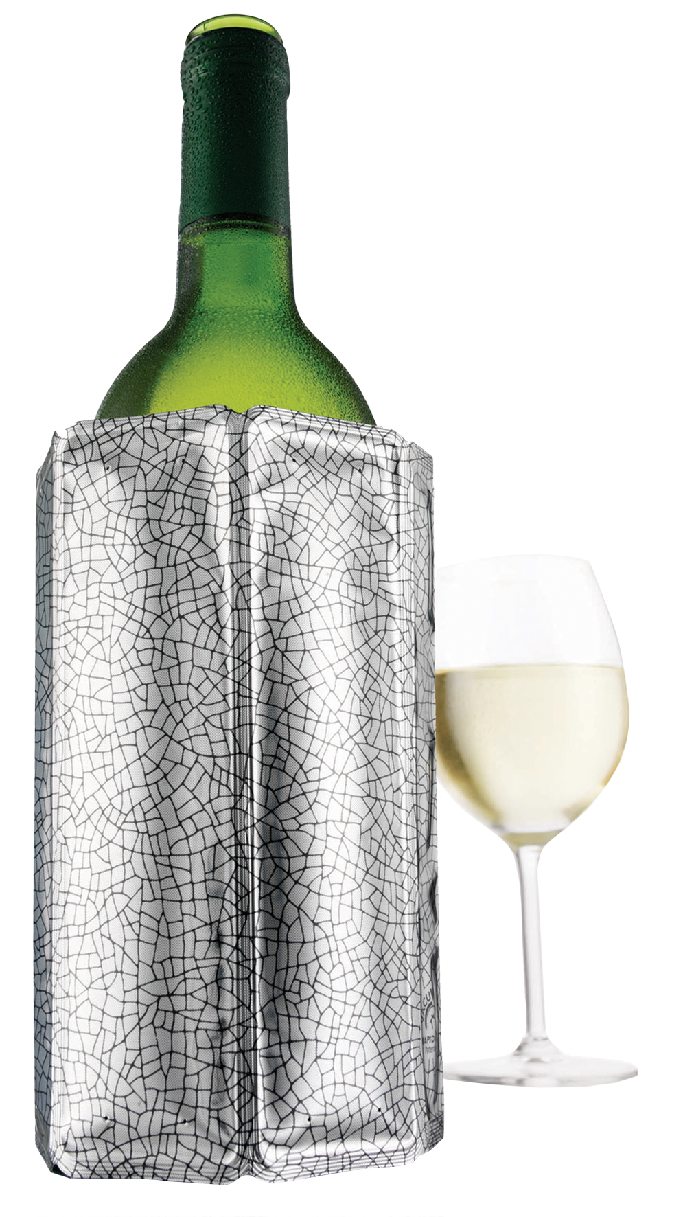 Kunststoff, gefüllt mit Kühlmasse, in der Kühltruhe aufbewahrt, kühlt sie eine Flasche innert 5 Minuten von Zimmertemperatur auf herrliche Frische