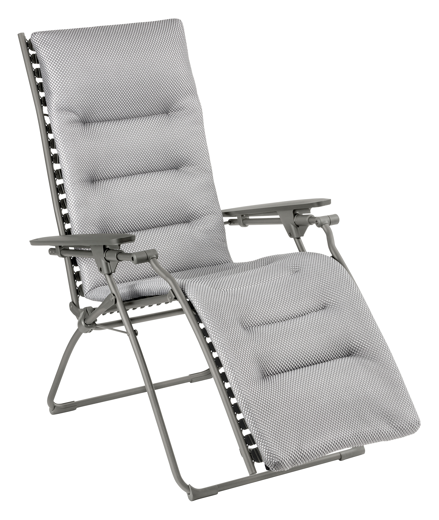 Mit dem LAFUMA EVOLUTION BeComfort in gepolsterter Ausführung können Sie den weichen Komfort eines Relaxsessels geniessen, der sowohl für den Innen- als auch für den Aussenbereich geeignet ist. Dieses Modell bietet ultimative Entspannung, denn es wurde entwickelt, um die ideale Entspannungsposition in Form eines Klappsessels zu bieten. Das wichtigste Prinzip ist die Positionierung der Beine leicht über Herzhöhe, wodurch Ihre Erholung optimiert wird. Unverzichtbar für die Entspannung auf der Veranda, im Garten oder ganz einfach im Haus. Das Gestell ist aus einem Ø 20 mm Stahlrohr mit einer Polyesterlackierung in der Farbe Titane. Die Liegefläche besteht aus einer dreilagigen Polsterung welche sich BeComfort nennt und ist atmungsaktiv, abnehmbar uns austauschbar wenn der Bezug im Laufe der Jahre ersetzt werden muss. Die Befestigung der Liegefläche besteht aus elastischen Clips, welche einen optimalen Liegecomfort gewährleisten. Die Armlehnen sind aus Kunstharz Farbe Anthrazit.