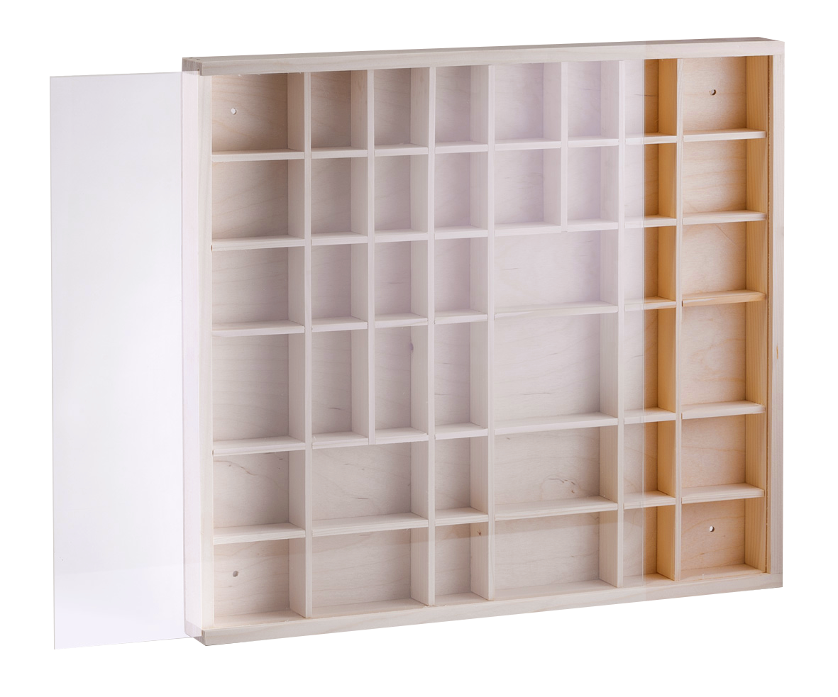 Der Setzkasten aus naturbelassenem Kiefernholz bietet Ihrer Sammlung den passenden Rahmen. Die Scheibe aus hochwertigem Acryl hält Staub fern. Der Kasten verfügt über insgesamt 42 verschieden grosse Fächer.