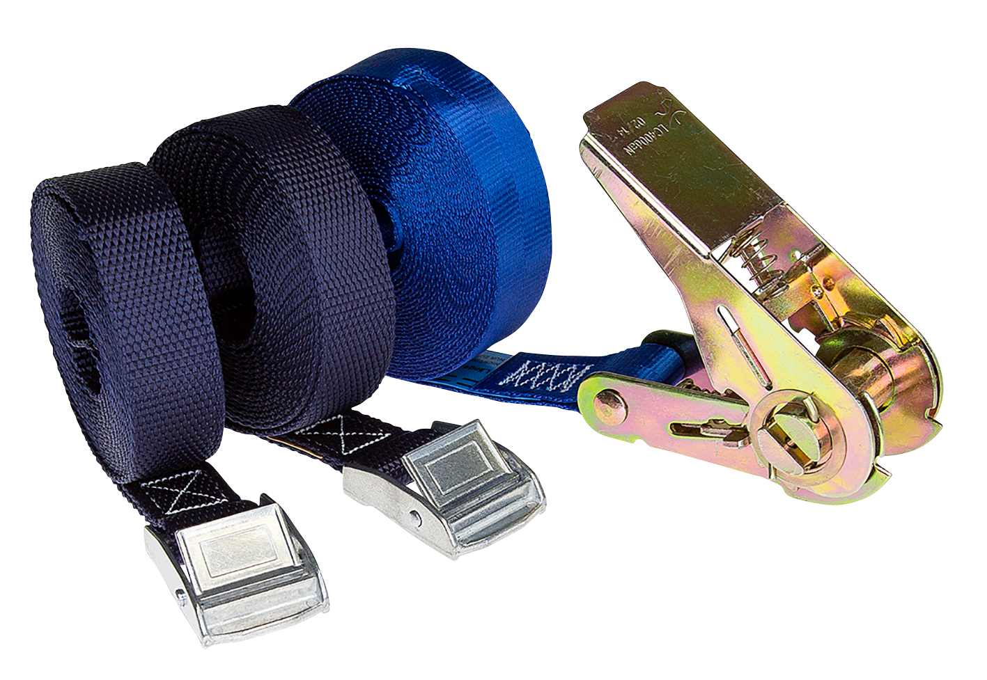 Set 3-teilig, bestehend aus 2 Stk. Gepäckträgergurten mit Klemmschloss, 3 m lang, 25 mm breit, aus Polypropylen, Bruchstärke in der Umreifung 500 kg, 1 Hobbygurt mit Ratsche 5 m lang, 25 mm breit aus Polyester, Bruchstärke in der Umreifung 1000 kg