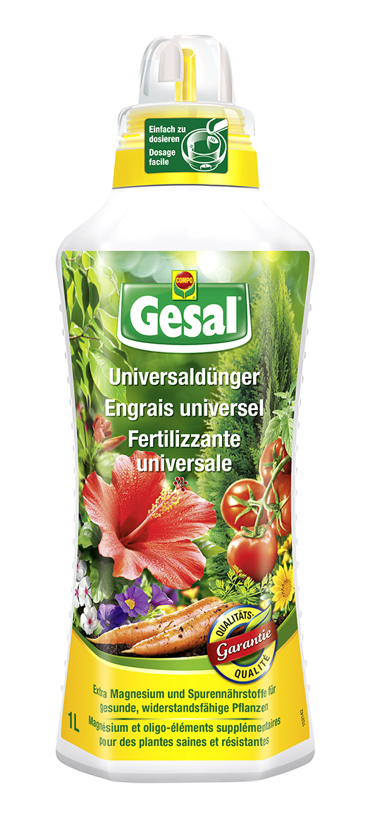 für Innen- und Aussenbereich, sehr breit anwendbarer mineralischer Flüssigdünger für Gemüse und Zierpflanzen, verhindert Mangelerscheinungen, NPK-Dünger 8+8+8 mit Spurenelementen, kann als Blattdünger (Spritzen) und als Wurzeldünger (Giessen) verwendet werden, die Nährstoffe werden auch über die Blätter aufgenommen, enthält Eisen-Chelat gegen die Vergilbung der Blätter, für gesundes Blattgrün und leuchtende Blütenfarben, reicht für ca. 500 l, kann allen Pflanzenschutzspritzungen beigemischt werden, einfache, saubere und tropffreie Dosiermöglichkeit durch Dosierverschluss, mit Sichtstreifen, genaue und gut verständliche Gebrauchsanweisung in bewährter Gesal Optik