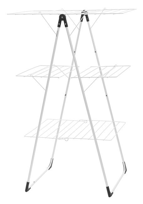 ausreichend Platz für eine komplette Waschmaschinenladung auf einem einzigen Quadratmeter, leicht zu falten und zu justieren, spezieller Griff, einfach zu falten und zu transportieren, kompakte Lagerung, auch im voll behangenem Zustand einfach zu transportieren, mit Transportsicherung, geeignet für die waagerechte Trocknung empfindlicher Wäschestücke, mit Trockenplattform, ermeidet Beschädigung am Fussboden dank robuster Schutzkappen, Höhe 135 cm