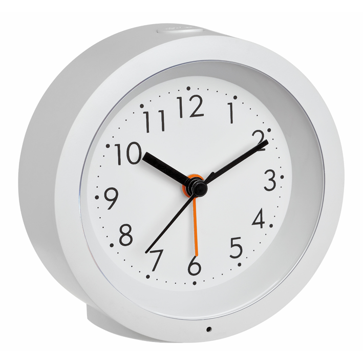 aus Kunststoff, elektronisch, analoge Anzeige, geräuscharmes Sweep-Uhrwerk, Alarm mit Snooze-Funktion, automatische Hintergrundbeleuchtung mit Lichtsensor, Batterien nicht im Lieferumfang enthalten, 2 x AA 1.5 V