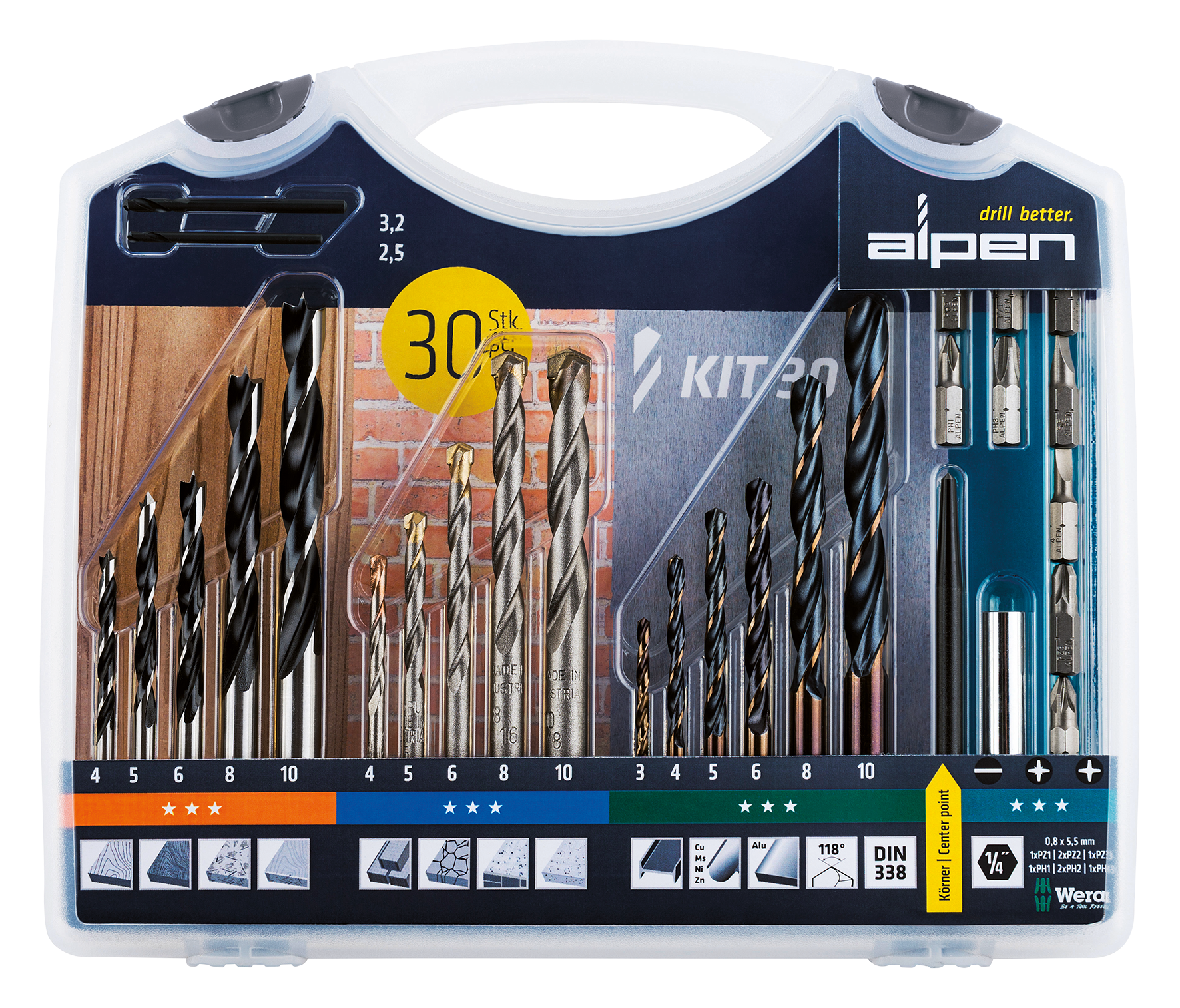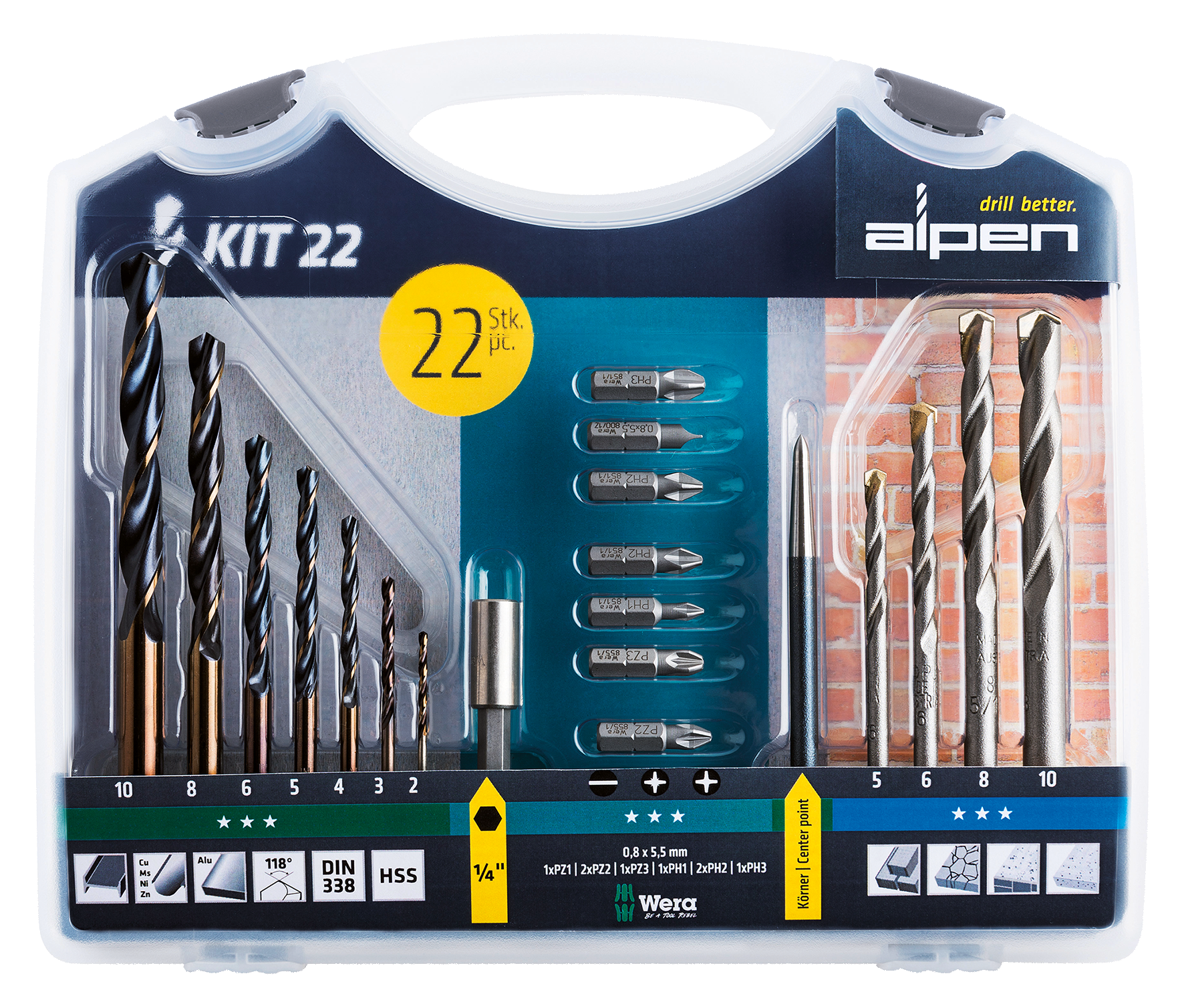 beinhaltet Holz ø 4, 5, 6, 8, 10 mm, HSS Super ø 2.5, 3.2 mm, Long Life ø 4, 5, 6, 8, 10 mm, Sprint Master Ø 3, 4, 5, 6, 8, 10, Wera 9 Bits sortiert, Bithalter, Körner