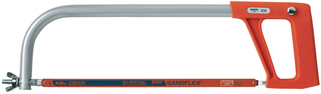 robuster und handlicher Metallsägebogen für universellen Einsatz, alternative Blattspannung 90° für bündige Schnitte, komplett mit Sandflex Bimetall-Blatt