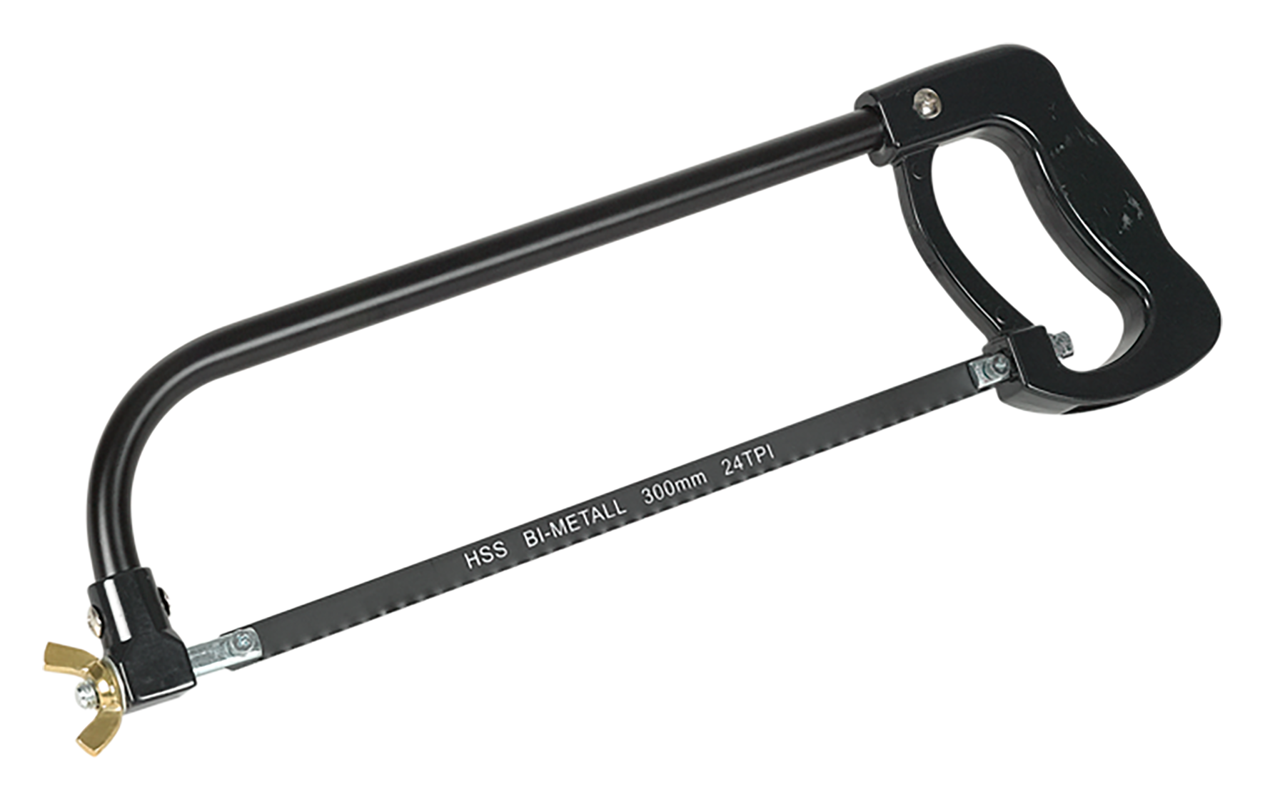 Stahlrahmen mit Kunststoffhandgriff für 300 mm Standard-Sägeblätter, Länge einstellbar, komplett mit einem Sägeblatt