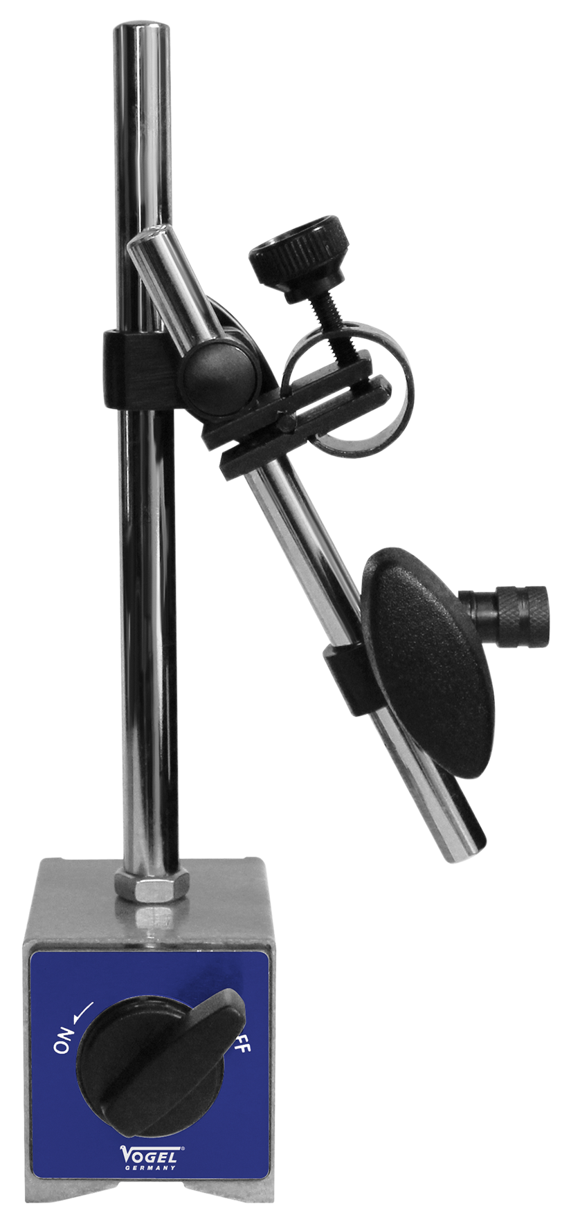 mit Magnet, für Messungen aller Art und jeder Position, Gestänge hochglanz verchromt, mit Feineinstellung, Magnetfuss lackiert, Haftkraft 60 Kp, Magnetfuss (65x50x55 mm) mit Ein/Aus-Drehschalter aus Kunststoff, mit prismatischer Sohle und mit rückseitig geschliffener Anschlagfläche, Spannung mit Kreuzkopf, Gewinde M8Messuhr-Aufnahmebohrung 4 mm und 8 mm