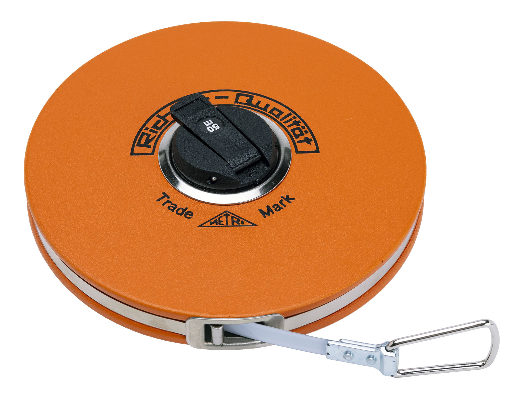 Glasfaserband, wetterfest, flexibel, Masseinteilung beidseitig in cm, Bandanfang verstärkt, Metallkapsel, kunststoffbeschichtet, vernickelte Kurbel
