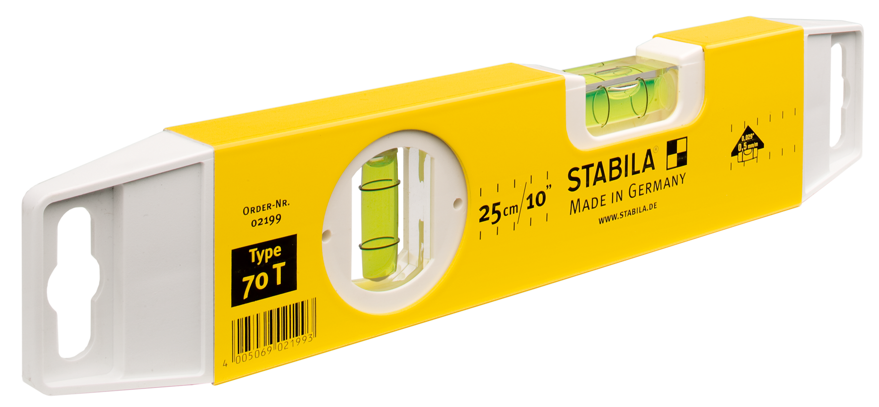 Diese leichte, vielseitige Wasserwaage ist ein unverzichtbarer Bestandteil jedes Werkzeugkastens. Dank ihrer kompakten Bauform eignet sich die 70 T besonders für Messaufgaben in beengten Verhältnissen und passt problemlos in die Seitentasche einer Handwerkerhose. Wie bei allen Wasserwaagen von STABILA werden Libelle und Messfläche im Produktionsprozess exakt zueinander ausgerichtet und anschliessend dauerhaft miteinander verbunden, um maximale Messgenauigkeit über viele Jahre hinweg sicherzustellen.