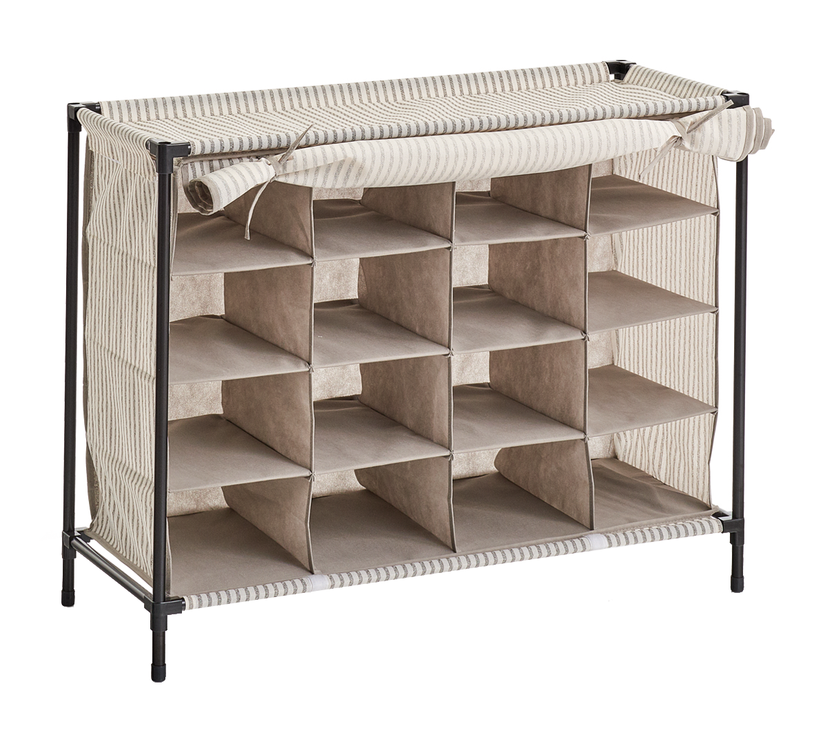 Dieses platzsparende, aber geräumige Schuhregal aus Vlies ist der ideale Ordnungshelfer für Diele oder Flur. Bis zu 16 Paar Schuhe finden Platz und können dank der Abdeckung unsichtbar verstaut werden.