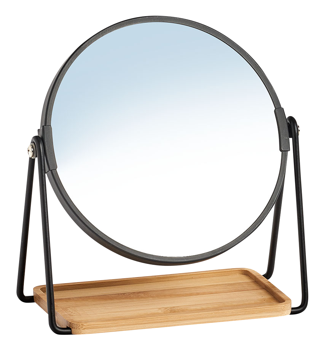 Der moderne Kosmetikspiegel im Industrial Design kombiniert schwarzes Metall mit nachhaltigem Bambus. Er lässt sich drehen und zeigt wahlweise eine 1:1 Darstellung oder eine Vergrösserung von 1:2 an. Die praktische kleine Ablage bewahrt Kosmetikartikel oder Schmuckstücke wie Ringe bis zum nächsten Einsatz sicher auf.