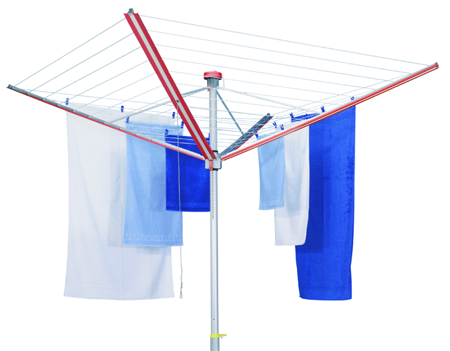 der besonders starke Wäscheschirm für hohe Ansprüche, Alu-Standrohr kunststoffbeschichtet (ø 55 mm), hohe Belastbarkeit der Tragarme, Bedienungshöhe bequem einstellbar, mit Verschluss Klinkenmechanik, inkl. Alu-Bodenhülse