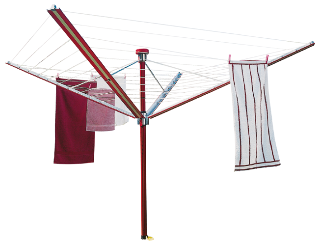 Wäscheschirm mit einem sich gleichmässig drehendem Oberteil, kein mühevolles Herumtragen des Wäschekorbs – Trockenarme lassen sich auf mit nasser Wäsche mühelos drehen, einfach zu bedienendes ‘Schirm-System’ – immer straffe Leinen – spannbar in 3 Positionen, stabile Aufhängeöse – einfache Aufbewahrung, extra Qualität, UV-beständige Trockenleine mit rutschfestem Profil – einfaches Auswechseln einzelner Leinen, alle Arme mit speziellen Vorrichtungen für Kleiderbügel – ideal für das Trocknen von empfindlichen Wäschestücken, inklusive verschliessbarem Metallbodenanker oder einer stabilen Verankerung ohne Beton, keine Hindernisse im Garten oder auf der Terrasse