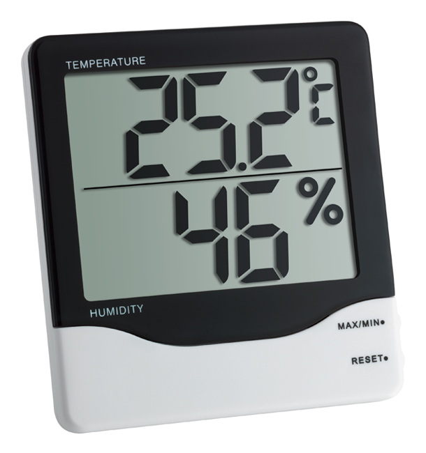 Kunststoff, zur Überwachung von Temperatur (Genauigkeit ±1 °C) und Feuchte (Genauigkeit ±4% von 35...75%, ansonsten ±5%) in Wohnräumen, Anzeige von Höchst- und Tiefstwerten, zusätzliche Funktionen wie Taupunkt und Alarmfunktion bei Schimmelgefahr, inkl. ausführlicher Gebrauchsanweisung mit vielen Tipps zum aktiven Heizen und Lüften, mit abnehmbarem Standfuss, Messbereich Temperatur innen -10...+60°C (+14...+140°F), Batterien 2x1,5 V AA im Lieferumfang enthalten